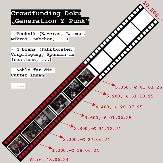 Wir haben uns aus verschiedenen Gründen entschieden, das Crowdfunding privat und nicht über eine Plattform laufen zu lassen. Zum einen sind da die rechtlichen Voraussetzungen: bei einigen etwa können nur gemeinnützige Organisationen Projekte einstellen, die Bürokratie, eine solche zu werden, wollten wir uns für ein einmaliges Filmprojekt nicht geben. Andere Plattformen haben hohe Gebühren oder bieten nur Bezahlarten an, die wir für unpraktisch halten. Vor allem haben wir uns gegen das Alles-oder-nichts-Prinzip entschieden, denn wir wissen noch überhaupt nicht, was uns finanziell erwartet. Wir können noch nicht abschätzen, ob wir am Ende mit mehreren hundert oder mehreren tausend Euro dastehen, um das Filmprojekt zu finanzieren. Einerseits sind Punx immer notorisch blank und grad in der aktuellen Lage hat niemand wirklich Geld übrig, andererseits geben wir alle gern ein bisschen mehr für Musik und Kultur aus, wenn wir das Gefühl haben, dass da was Gutes bei rumkommt.